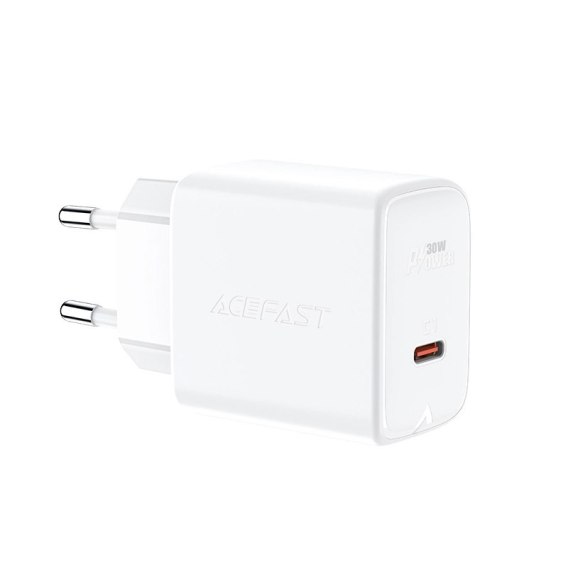 Szybka ładowarka sieciowa marki Acefast. Posiada port USB Typ C, który umożliwia ładowanie z mocą do 30W. Pozwala na szybkie ładowanie urządzeń m.in. w standardach PPS, Power Delivery, Quick Charge 3.0, AFC i FCP. Jest wykonana z ognioodpornego materiału PC. Została wyposażona w wiele zabezpieczeń takich jak np. przed przegrzaniem, przepięciem, wysokim napięciem czy przeciążeniem. Elektroniczne komponenty ładowarki zostały wykonane w technologii GaN czyli są oparte na azotku galu, a nie na krzemie. GaN to lepsza efektywność pracy i mniejsze zużycie energii.