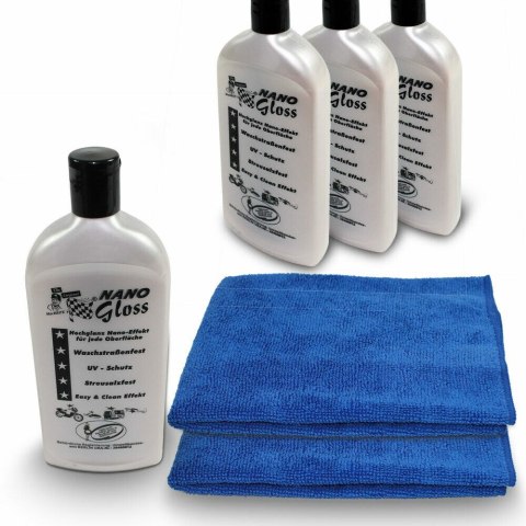 Zestaw do zastosowań polerskich składający się z politury MacBRITE Nano Gloss oraz kompletu ścierek z mikrofibry. Komplet niezbędny by zadbać o wygląd twojego samochodu.Nano cząsteczki politury MacBRITE Nano Gloss wypełniają nierówności farby - lakieru, tworząc płaską, warstwę lśniącej powłoki lakierniczej, jednocześnie zabezpieczając ją przed pyłem i brudem. Ponadto farba będzie mniej podatna na korozję i tym samym bardziej wytrzymała.