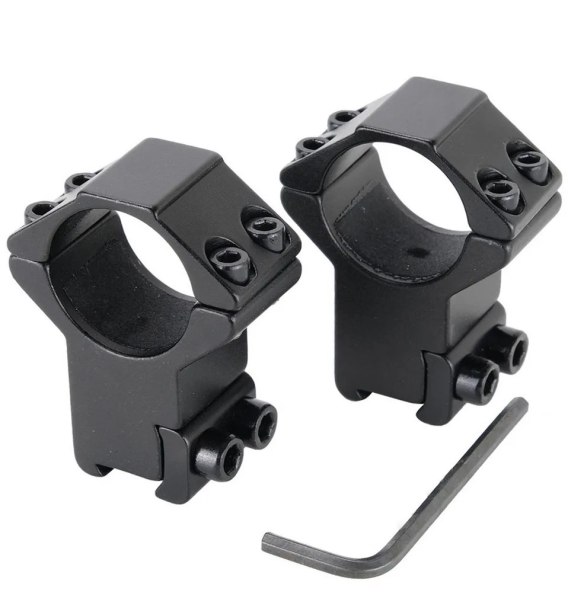 Dwuczęściowy montaż lunety 1", wysoki, na szynę 11 mm. Aluminium, odporność na odrzut, taśma ochronna, łatwy montaż.