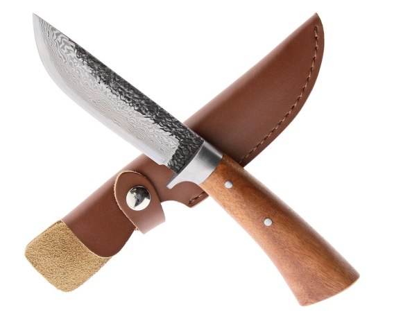 Klasyczny, zgrabny myśliwski nóż wykonany ze 83 warstwowej stali damasceńskiej. Rdzeń ze stali T10 obłożony stalą AISI 1060/1020. Tego typu zabieg powoduje, że nóż jest jednocześnie bardzo twardy i elastyczny. Głownię zahartowano na 60-61 HRC przez co bardzo długo pozostaje ostra. Drewniana duża rękojeść o owalnym przekroju z rozszerzającym się tyłem, zwięk
