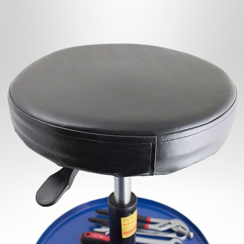 W podstawie pojemnik na narzędzia i akcesoria niezbędne w trakcie pracy. Krzesło warsztatowe przydatne jest we wszelkiego rodzaju warsztatach, serwisach i garażach. Obrotowe siedzisko pozwala przyjąć użytkownikowi wygodną pozycję podczas pracy, pięć rolek obrotowych zwiększa mobilność podczas pracy. Solidna konstrukcja pozwala na obciążenie do 135kg, charakteryzuje się atrakcyjnym stosunkiem ceny do jakości.